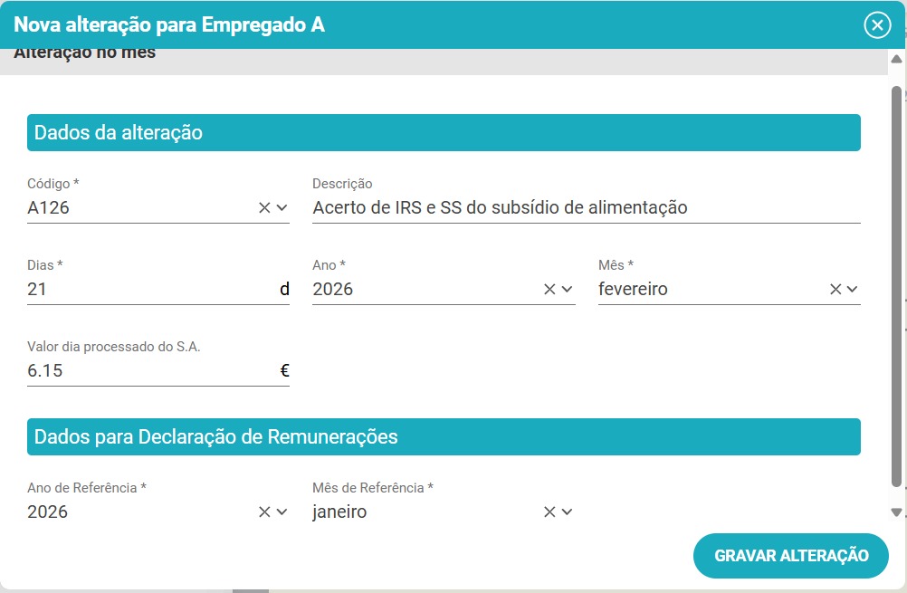 Para aplicar os retroativos referente ao subsídio de alimentação, deve selecionar o abono “A126-Acerto de IRS e SS do subsídio de alimentação”: