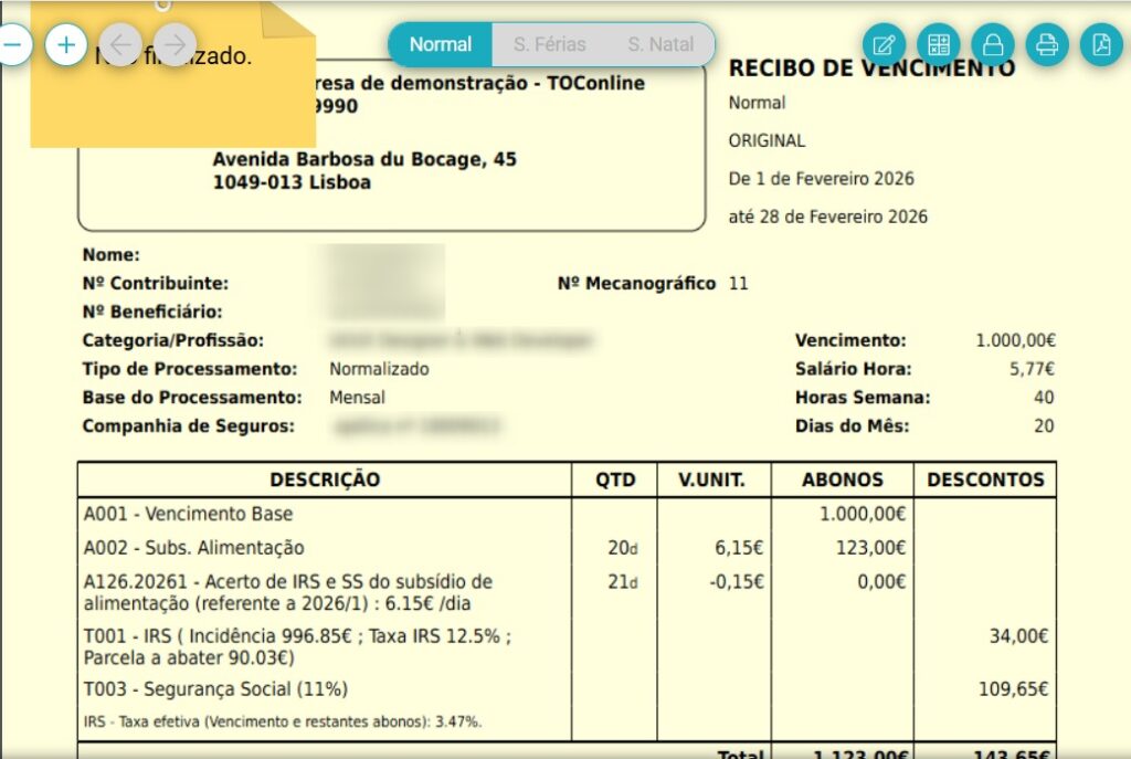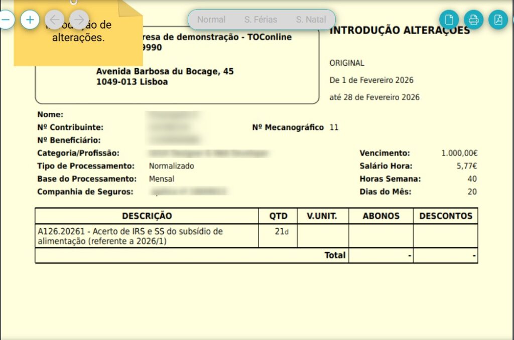O TOConline ajustou o cálculo do abono A126 para permitir regularização em conformidade com o aumento do subsidio de refeição.