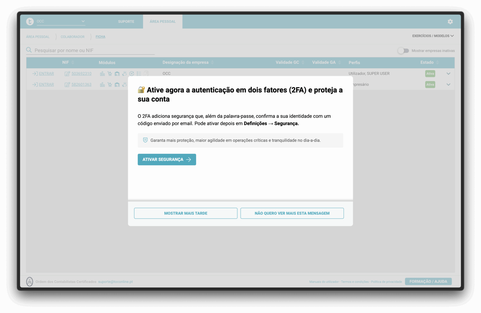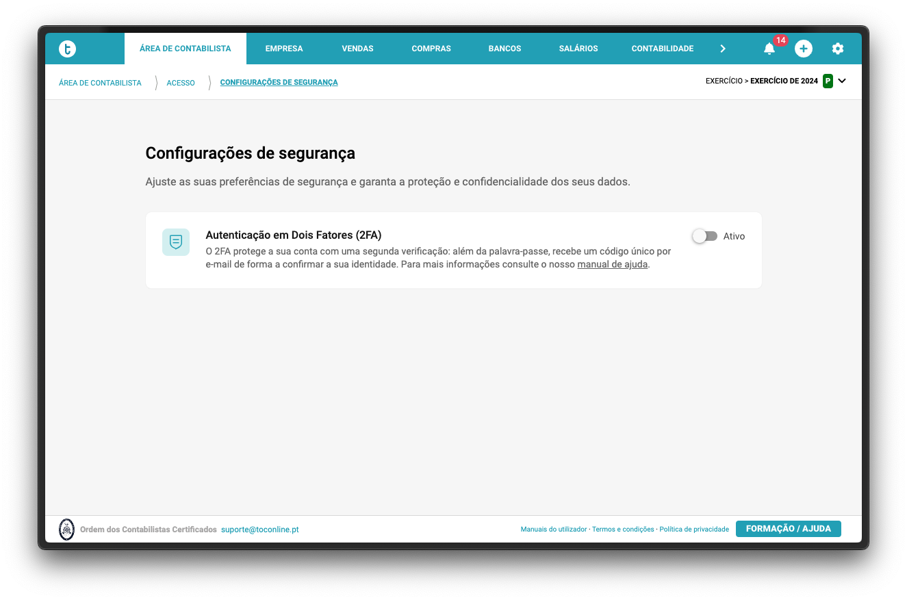 O 2FA (Autenticação em Dois Fatores) é uma camada adicional de segurança que garante que só o verdadeiro titular do acesso consegue entrar no TOConline.