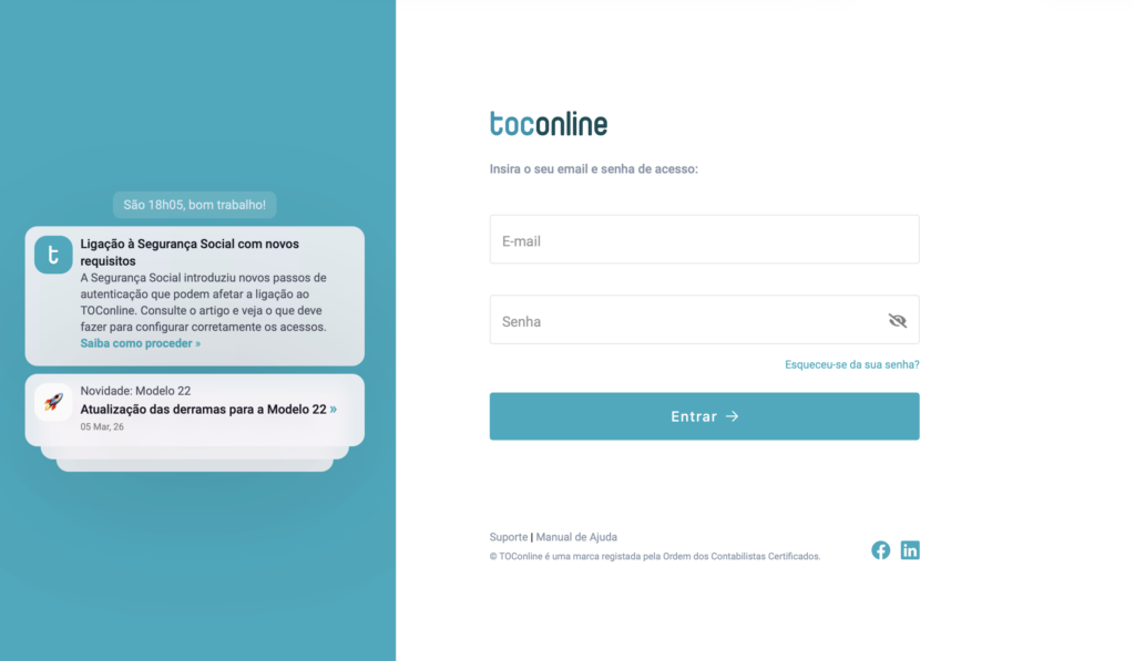 O sistema de autenticação mantém-se exatamente igual, incluindo todas as validações e mecanismos de segurança já existentes. A alteração introduz uma nova estrutura visual que transforma a página de login num ponto de informação útil para quem utiliza o TOConline diariamente.
